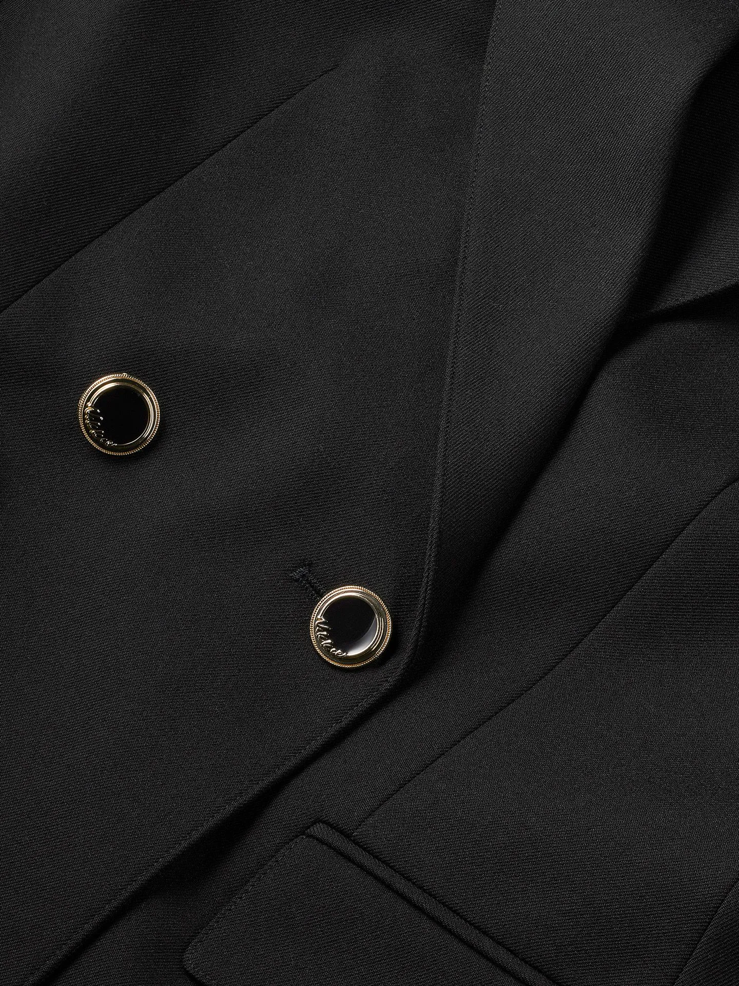 Blazer clássico de abotoamento duplo, com gola de lapela e bolsos com aba. De modelagem regular e acabamento liso, é uma peça versátil e intemporal, ideal para looks elegantes e profissionais.