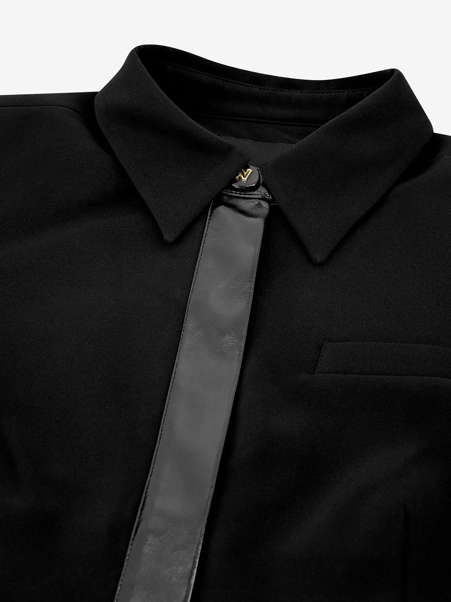 Blazer cropped com gola, fecho de correr e botão e pormenor em pele sintética. O blazer possui um bolso decorativo no peito com um detalhe de logotipo.