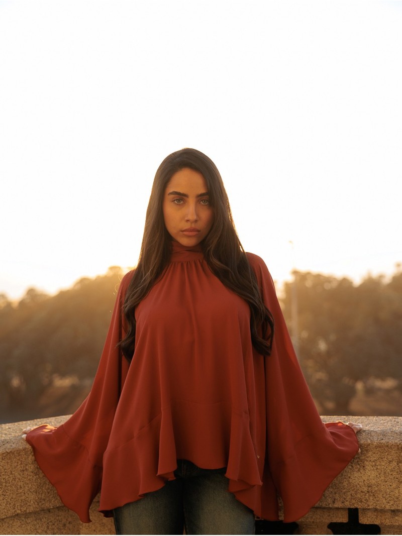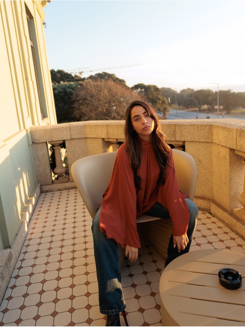 Blusa elegante e feminina, com corte fluído e detalhe de folhos que acrescenta movimento e sofisticação ao look. Gola subida e silhueta solta para máximo conforto. Ideal para looks formais ou ocasiões especiais.