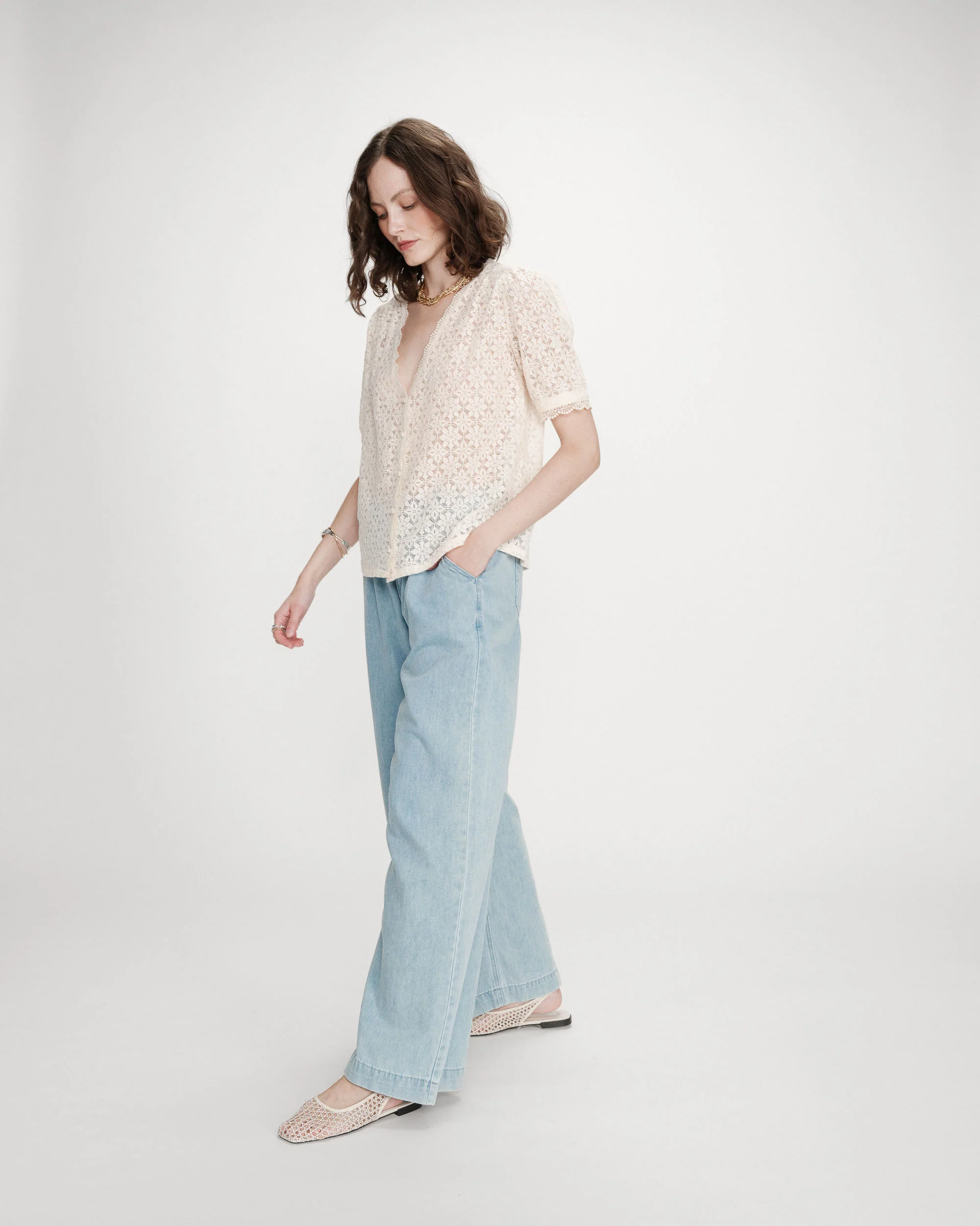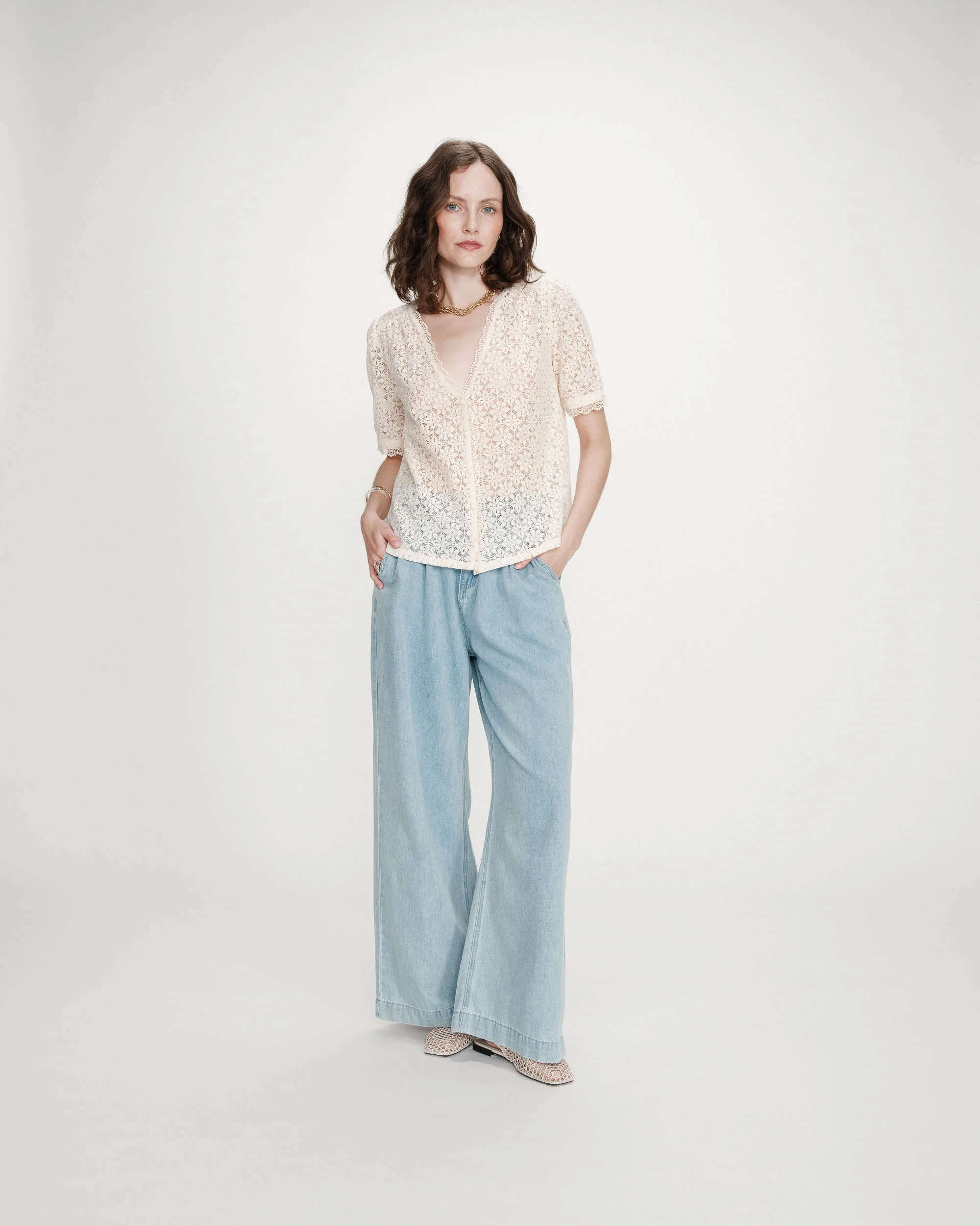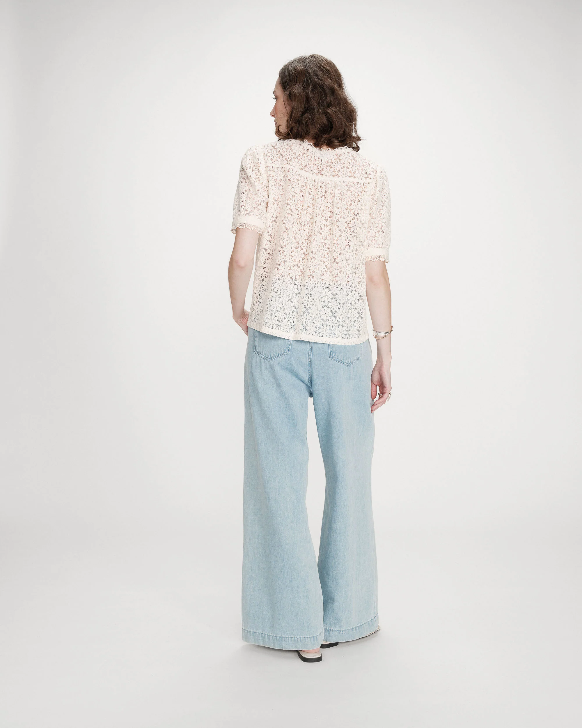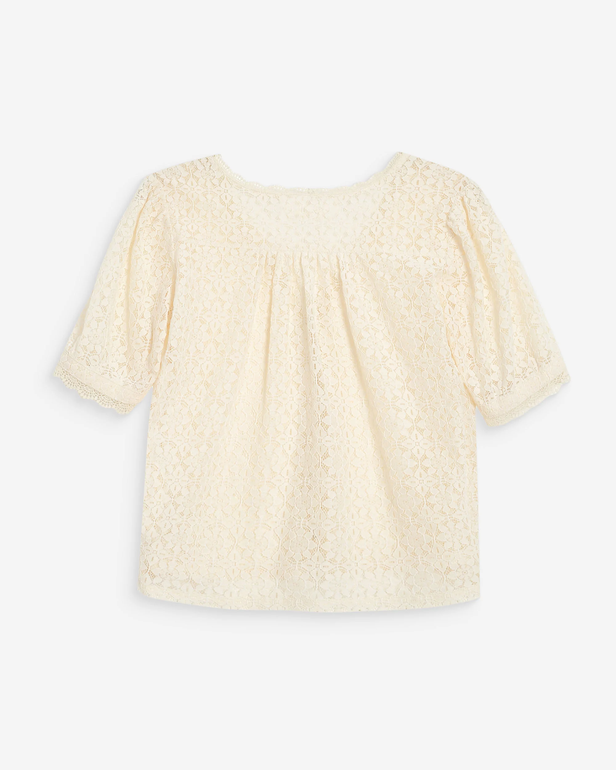 A Blusa VICKY em renda destaca-se pela sua leve transparência e textura delicada, perfeita para criar combinações femininas e versáteis. Com mangas curtas e corte reto, oferece conforto e um caimento leve para diferentes ocasiões.
