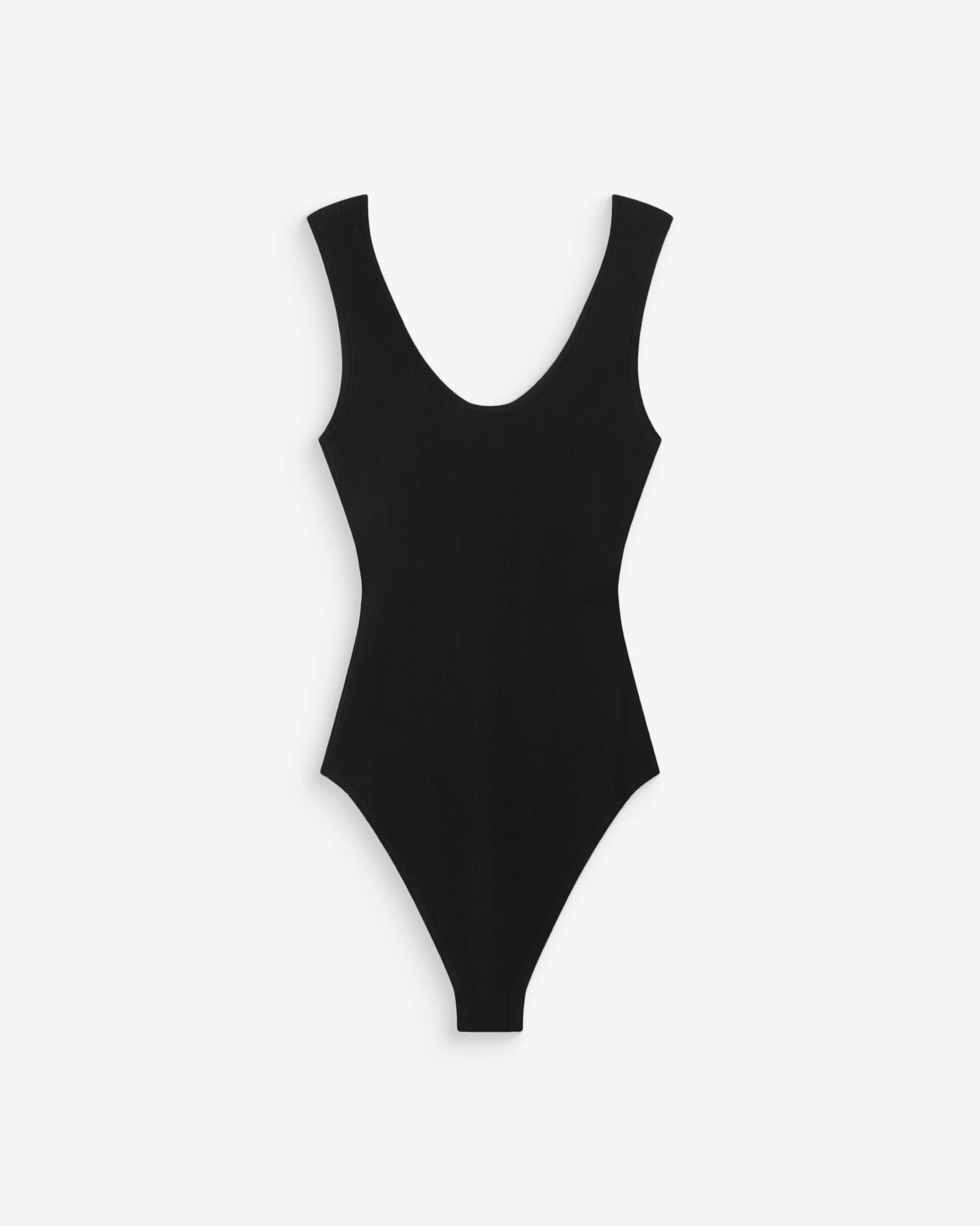 Feito em tecido canelado fino, este body possui corte ajustado e decote redondo, valorizando as curvas e criando uma silhueta minimalista. O acabamento tubular e os fechos de pressão na entrepernas garantem conforto e praticidade.