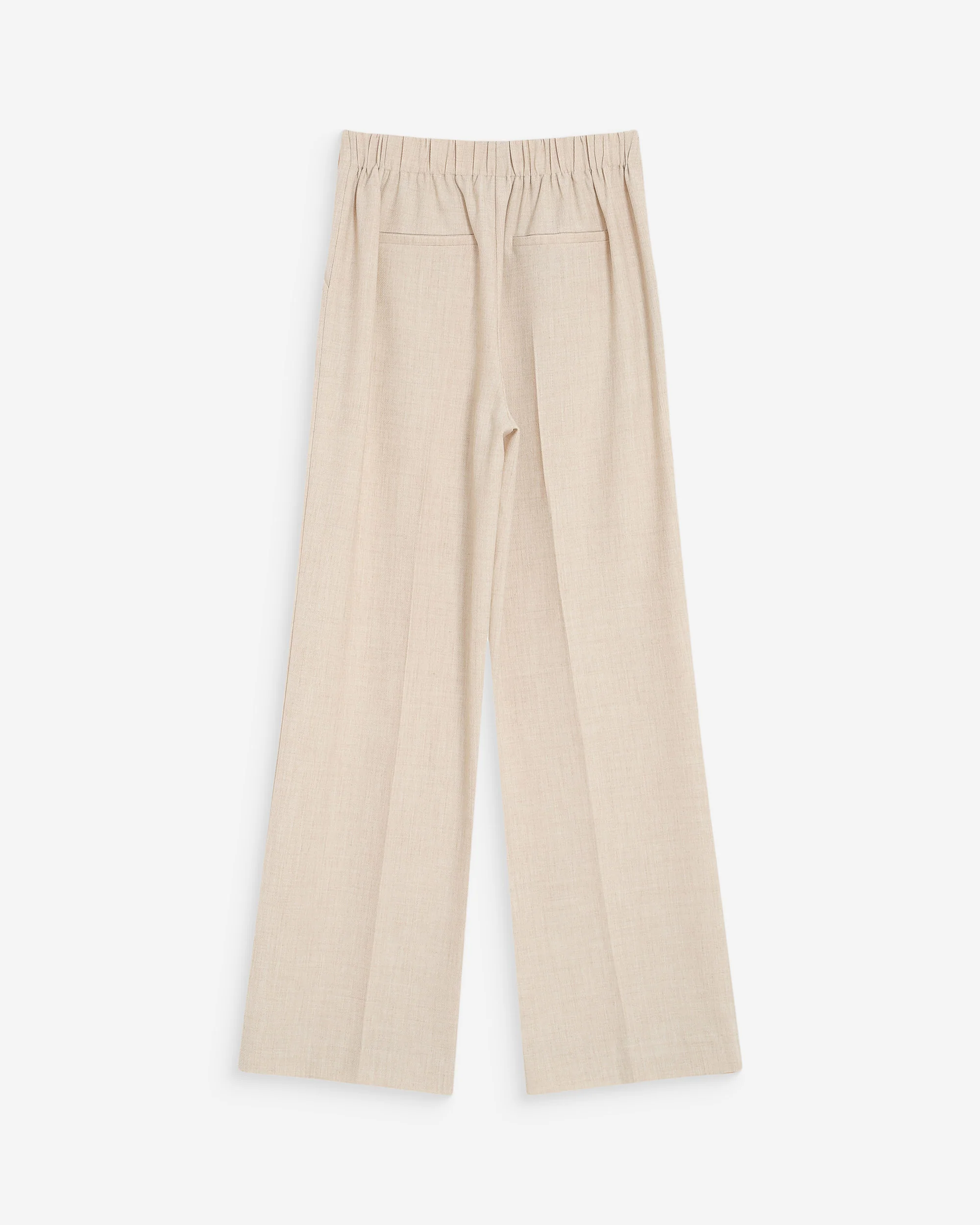 Com um corte elegante, estas calças de alfaiataria destacam-se pelo cós traseiro alto com elástico, que garante conforto e ajuste. Os bolsos italianos e os detalhes de botões, aliados aos vincos marcados, conferem uma silhueta cuidada e atual.