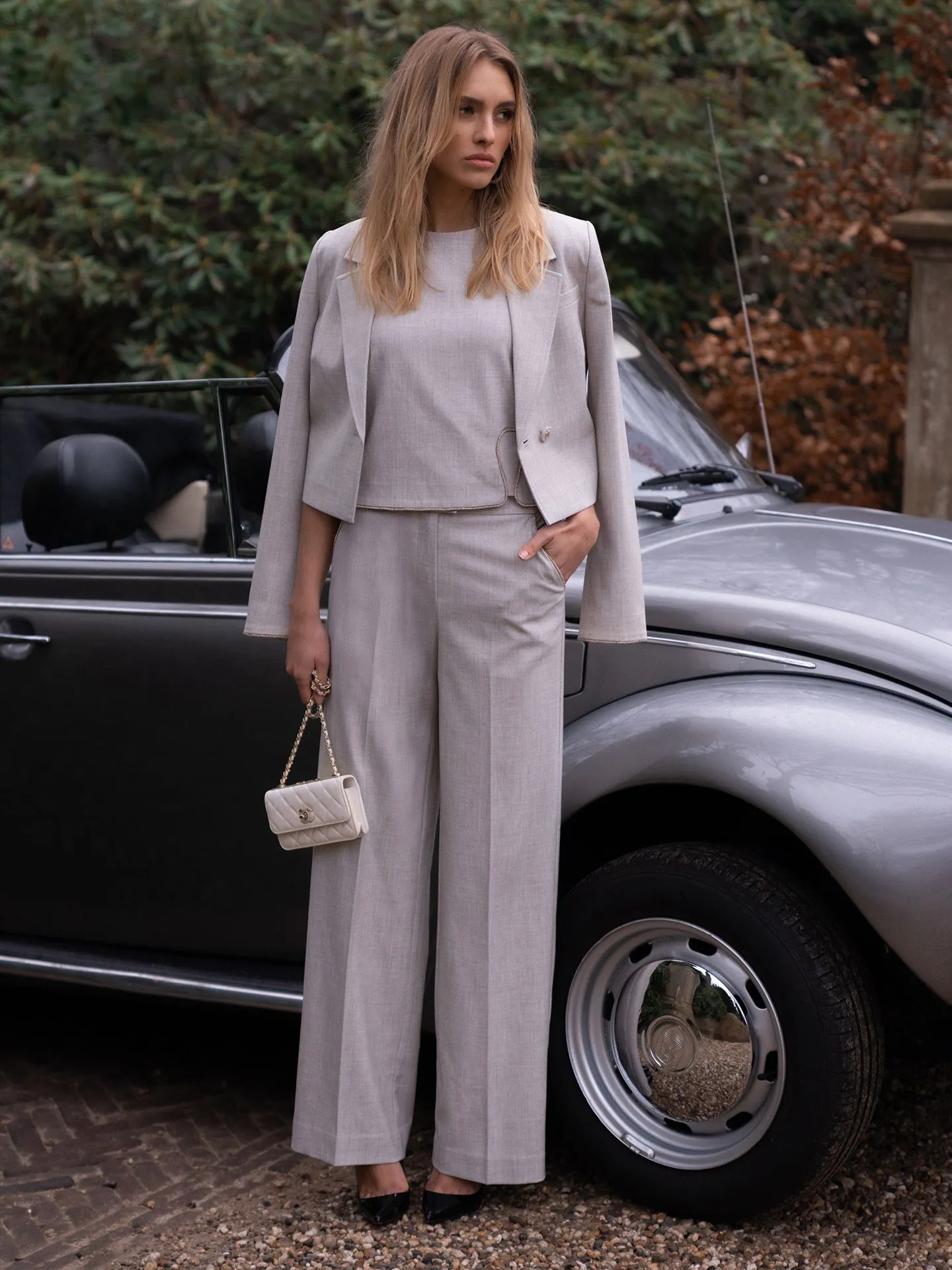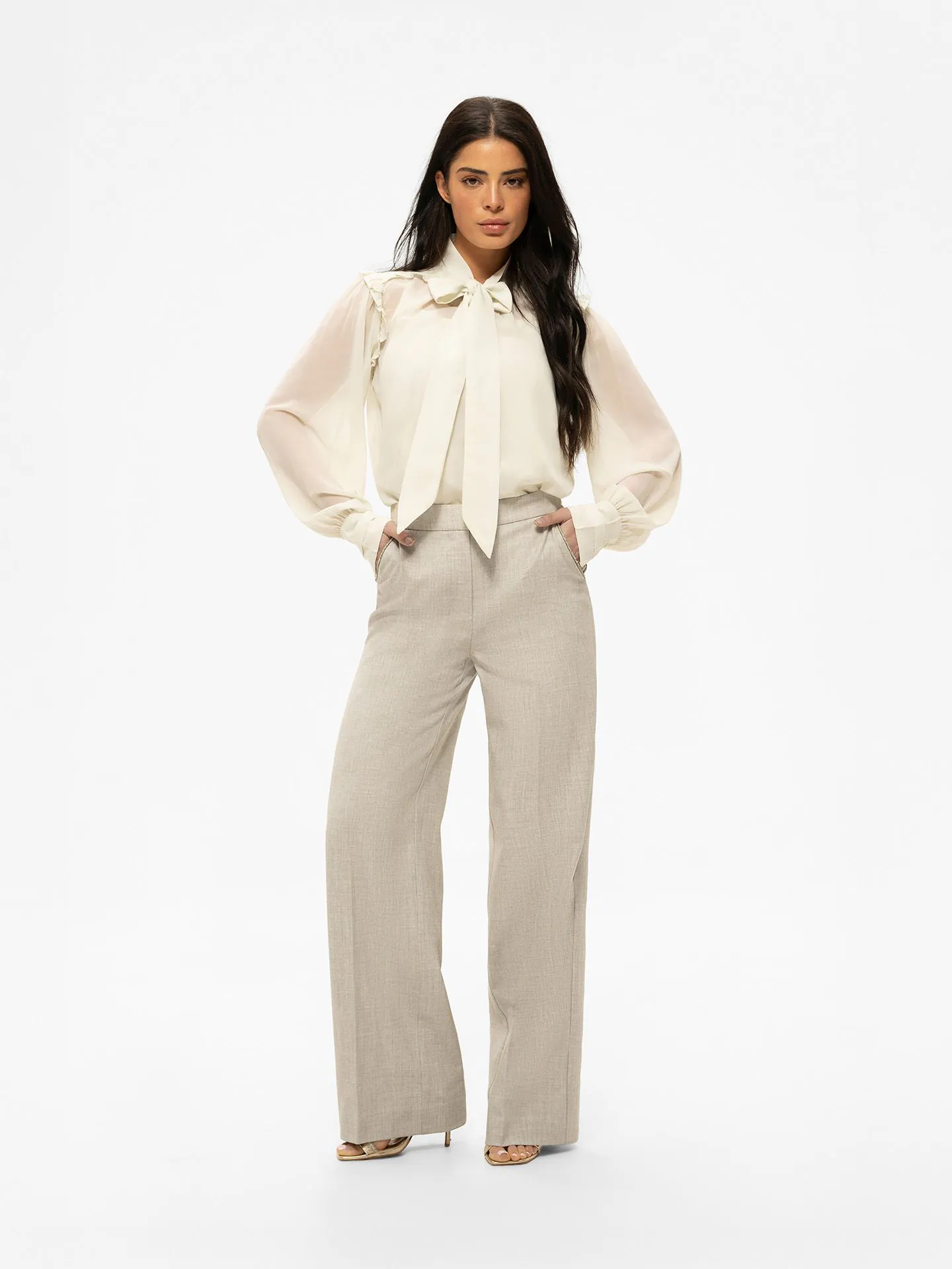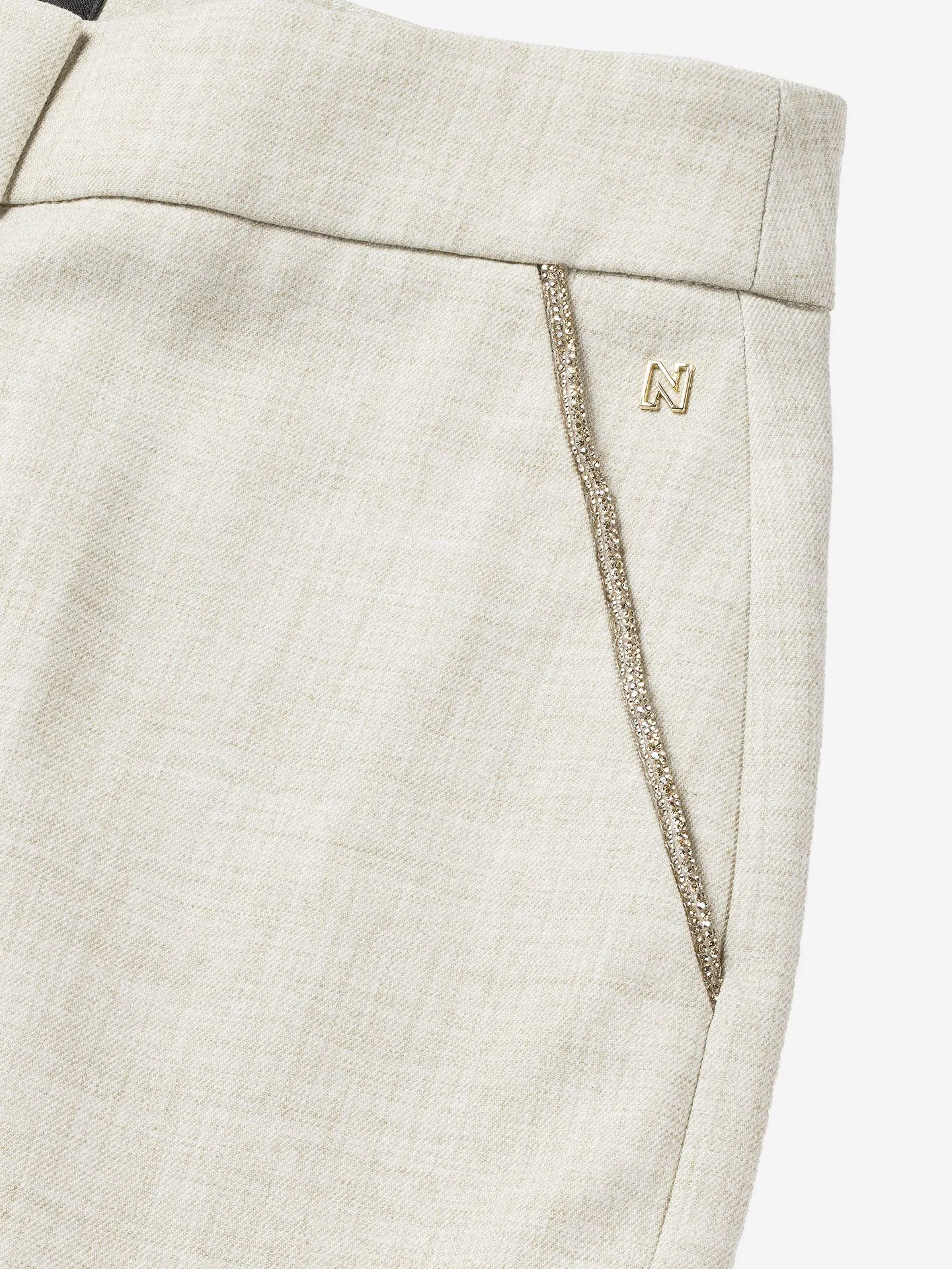 Calças em linho com pregas, bolsos laterais com detalhes em glitter. De cintura média, este modelo de calças é wide leg e contém fecho com colchete.