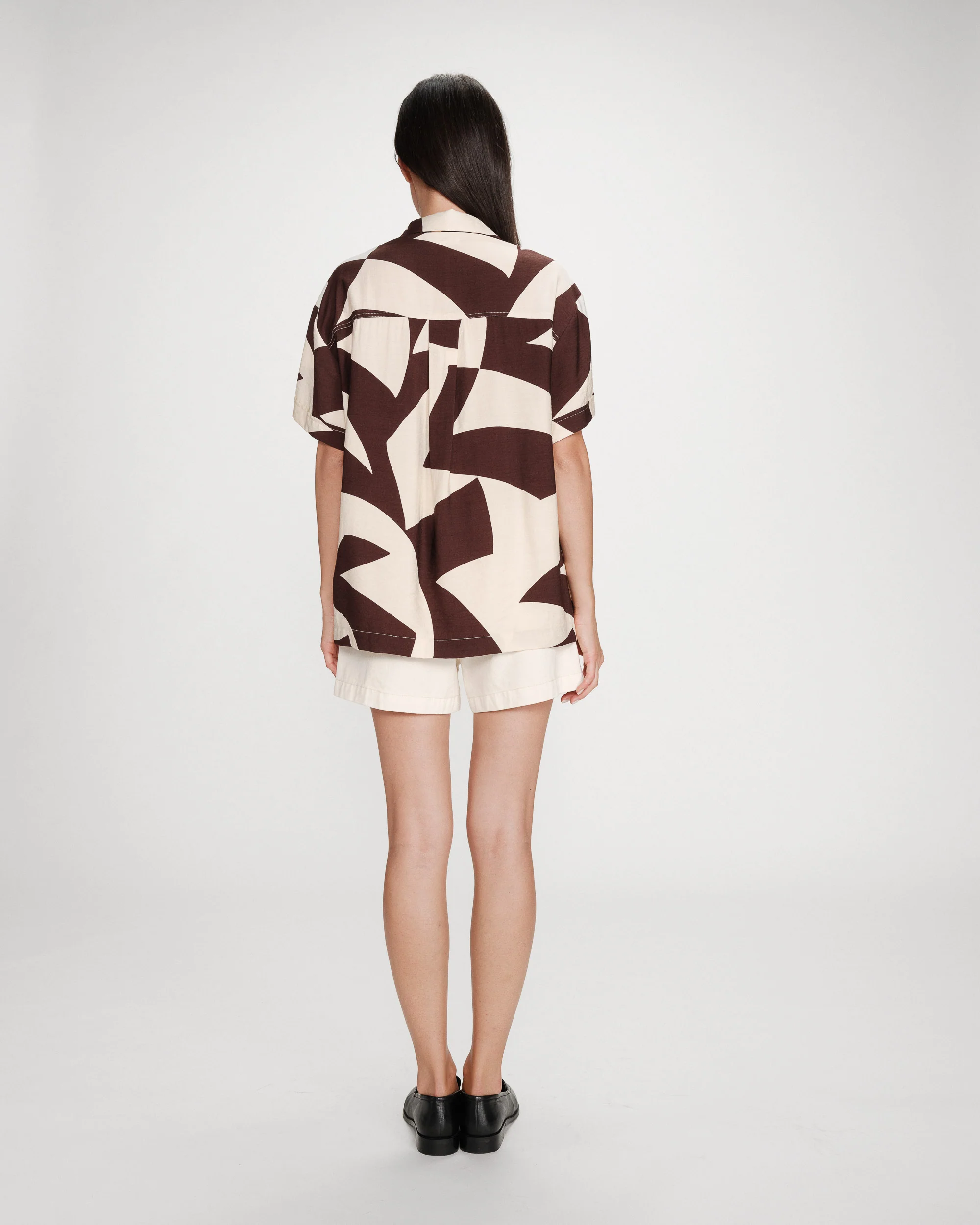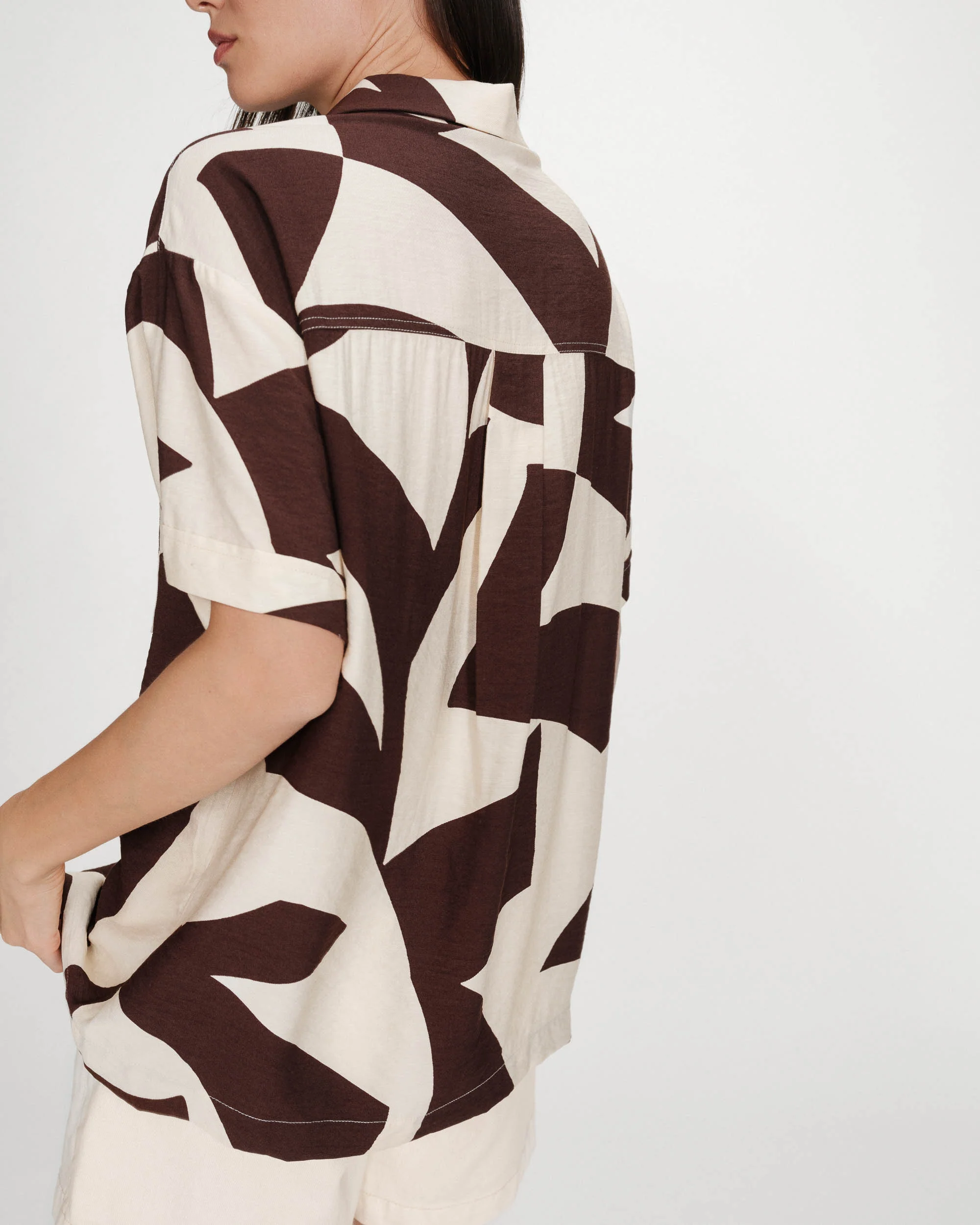 Camisa com estampado geométrico que se destaca pelo visual marcante. A modelagem reta garante conforto e um caimento fluido, enquanto a gola clássica e o fecho frontal com botões equilibram a peça.