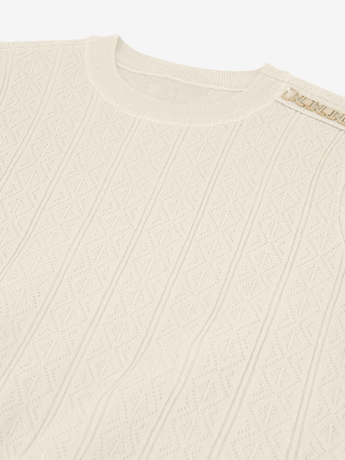 Suéter de malha fina com um padrão tecido, um decote redondo e um detalhe de logotipo de metal no ombro. O suéter possui punhos canelados e um ajuste regular.