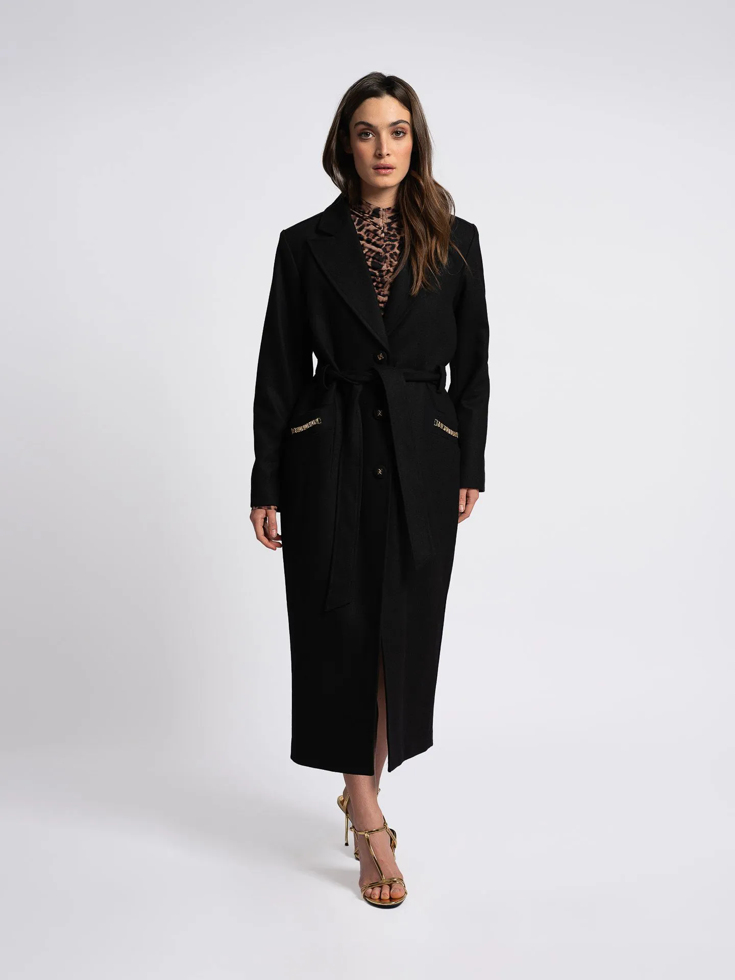 Casaco longo de mistura de lã com gola, cinto de amarração e detalhes de corrente. O casaco possui bolsos, fecho de botão e um ajuste relaxado.