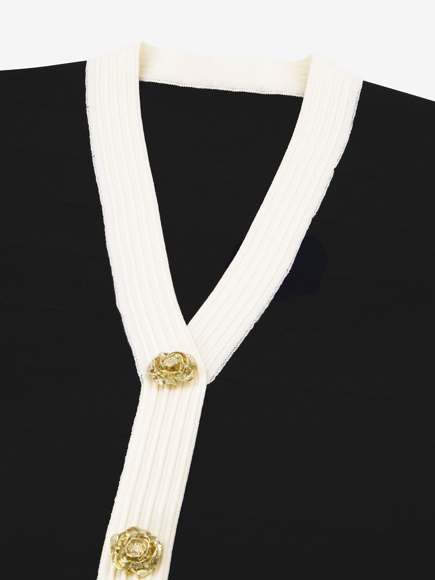 Cardigan justo com painéis horizontais, decote em V e punhos contrastantes. O cardigã apresenta botões florais.