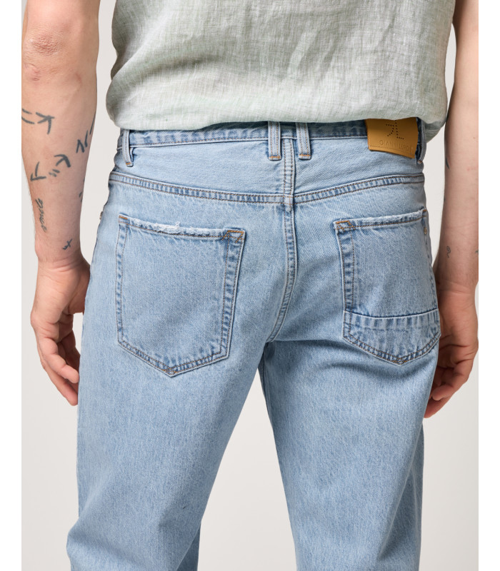 A lavagem azul vintage confere um acabamento autêntico e urbano, perfeito para looks casuais ou smart casual. O design é complementado por fecho com botão e zíper, garantindo praticidade no dia a dia, e etiqueta com logotipo na parte de trás, que reforça a identidade premium da marca.
