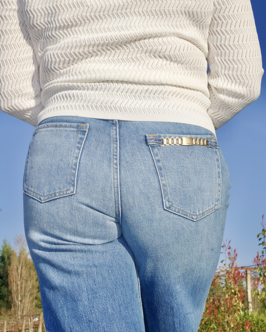 Jeans wide leg com bolsos e detalhe de corrente na parte de trás, perfeitos para um look moderno e descontraído. A modelagem regular aliada à perna larga garante conforto e liberdade de movimento. detalhe de corrente acrescenta um toque urbano e diferenciador à peça.