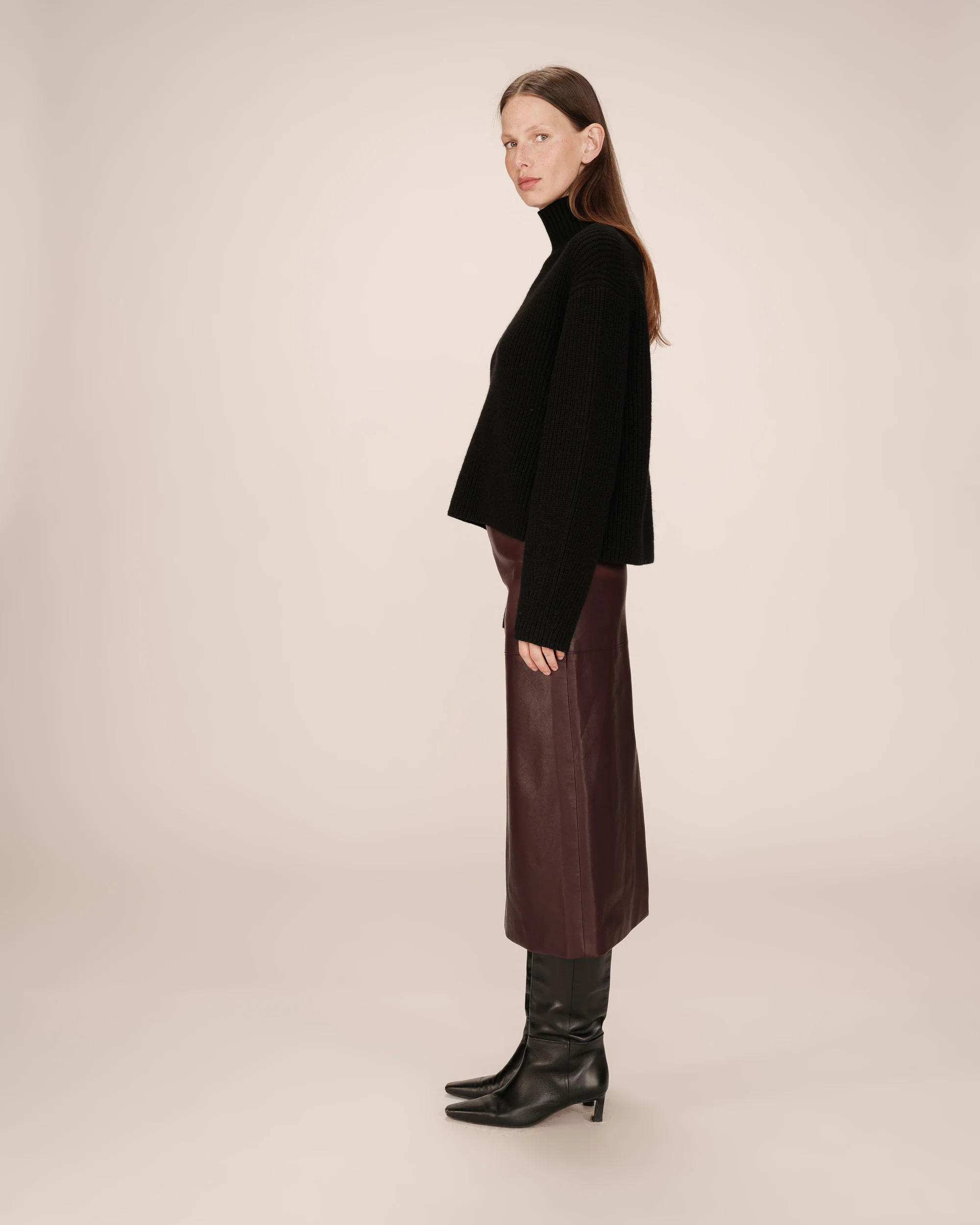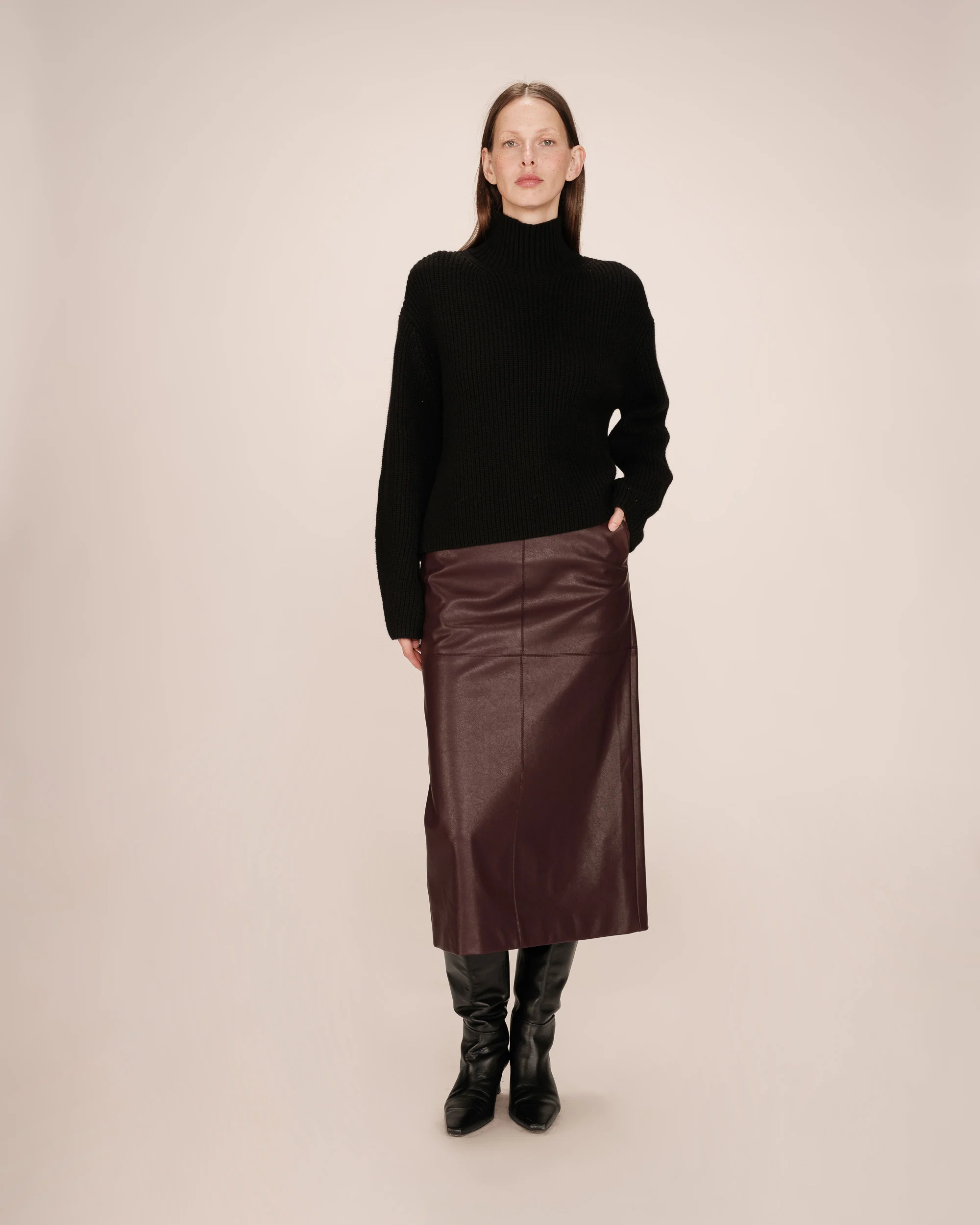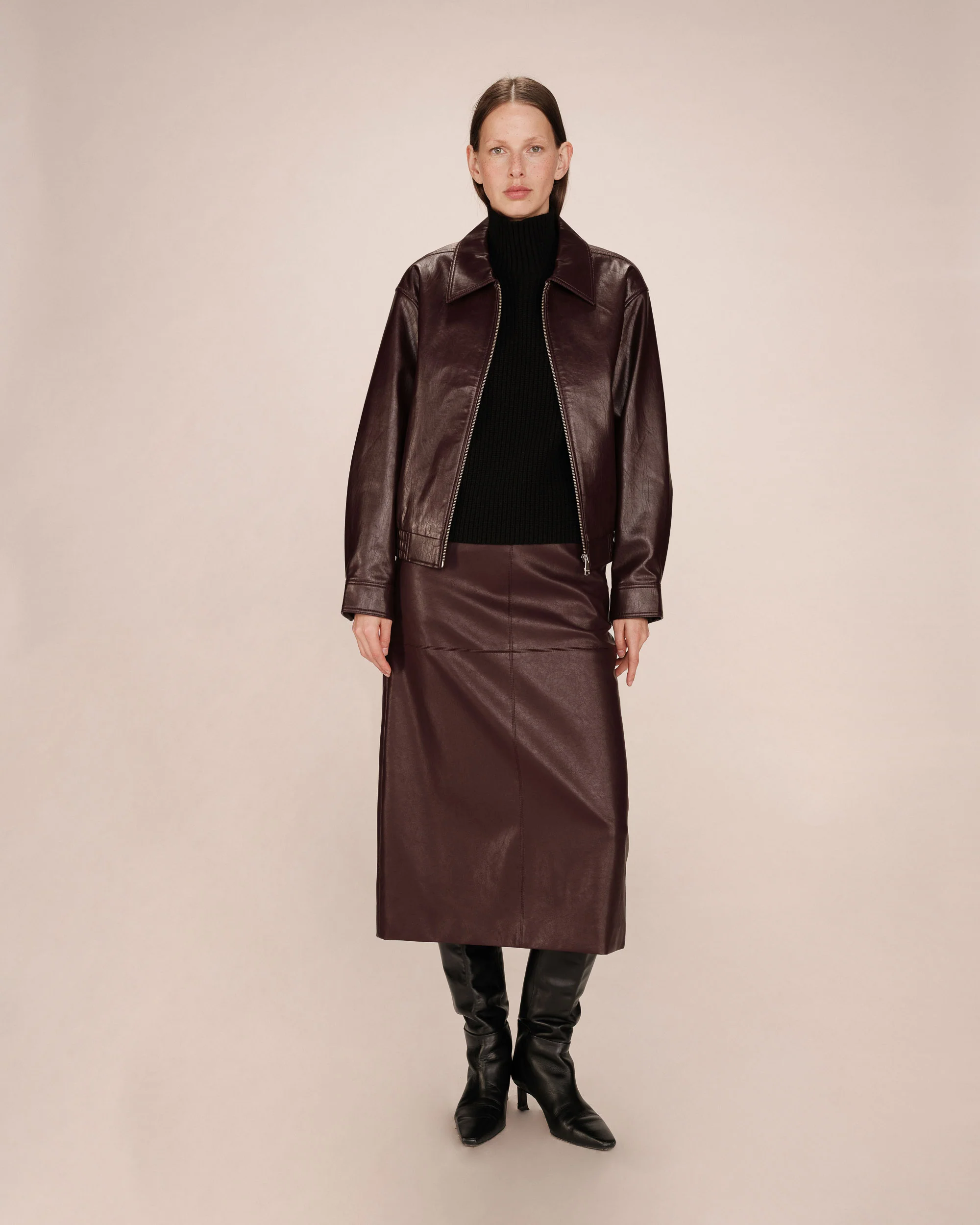 A saia midi em couro sintético bordeaux SIRENE, da coleção Grace & Mila, é uma peça feminina e marcante que combina ousadia e sofisticação.